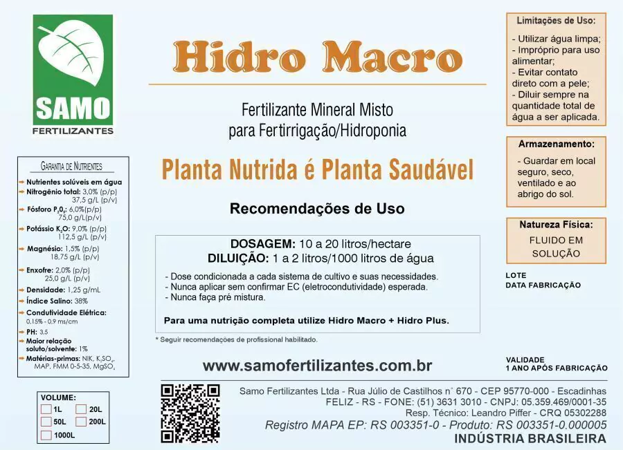 N total: 3% / K sol em água: 9% / P sol em água: 6% / Mg sol em água: 1,5% / S sol em água: 6% / Índice salino 38% pH 3,5% Densidade: 1,25 gr/ml.